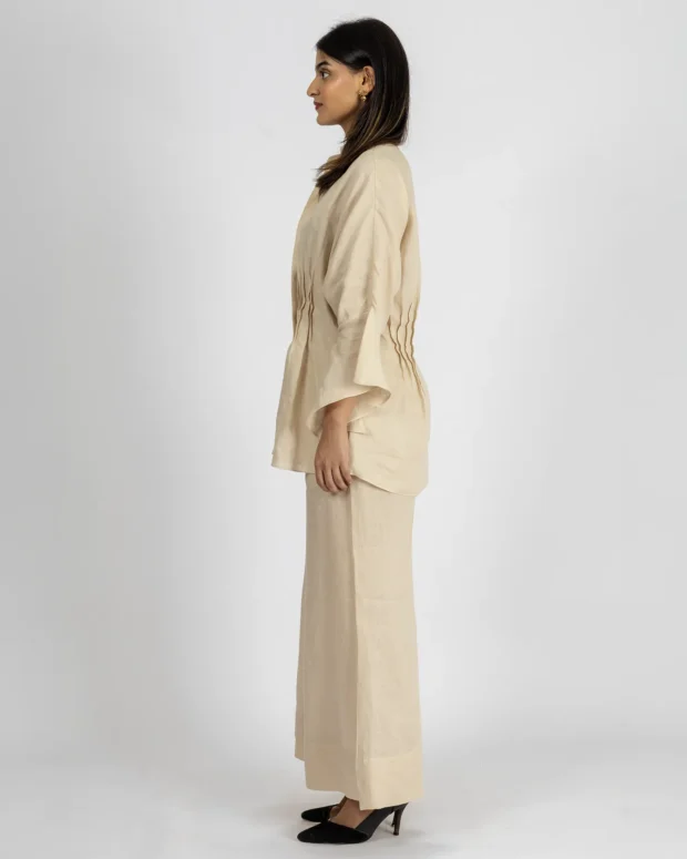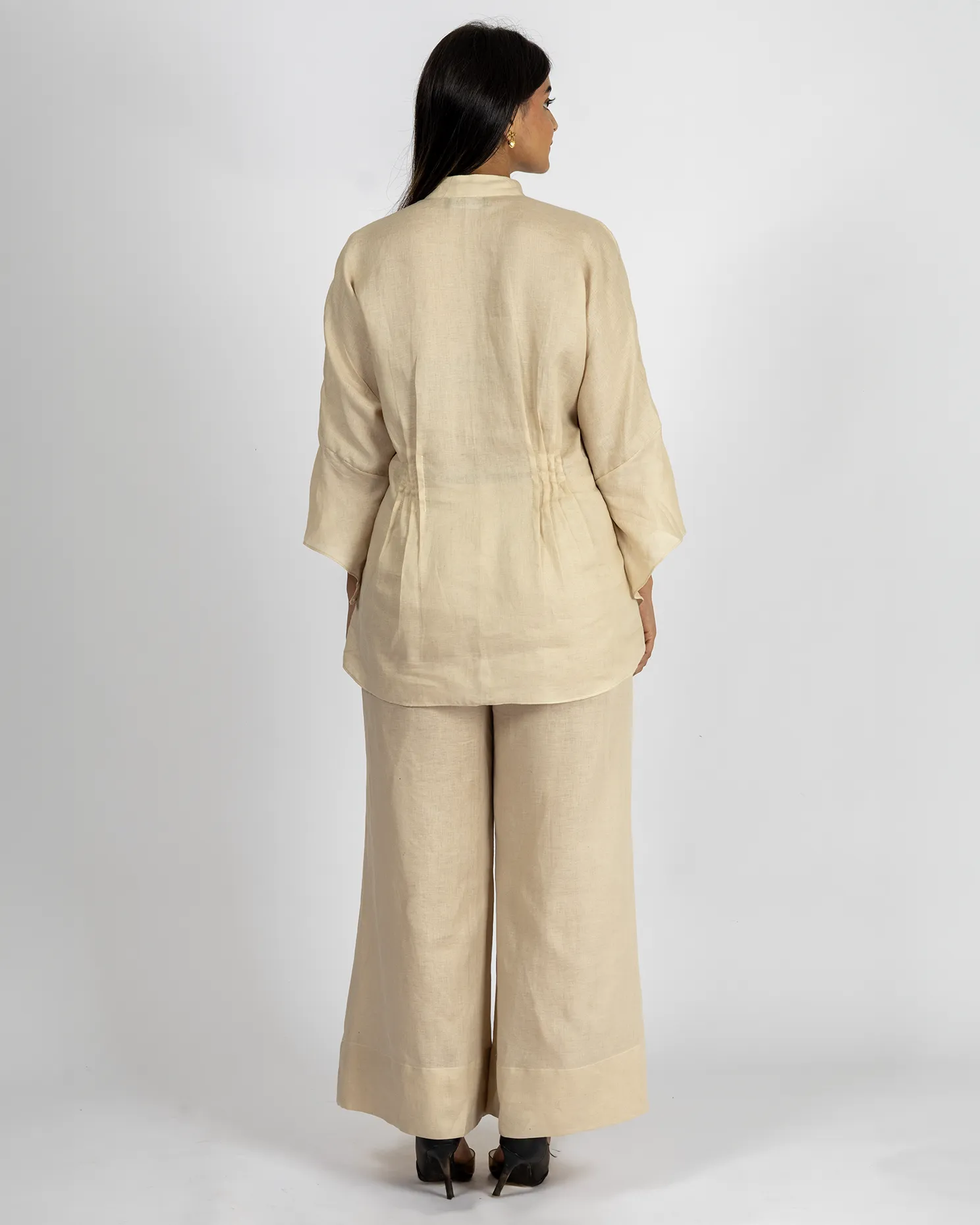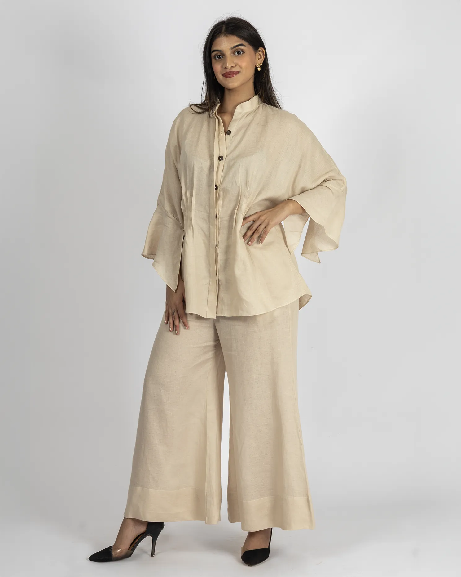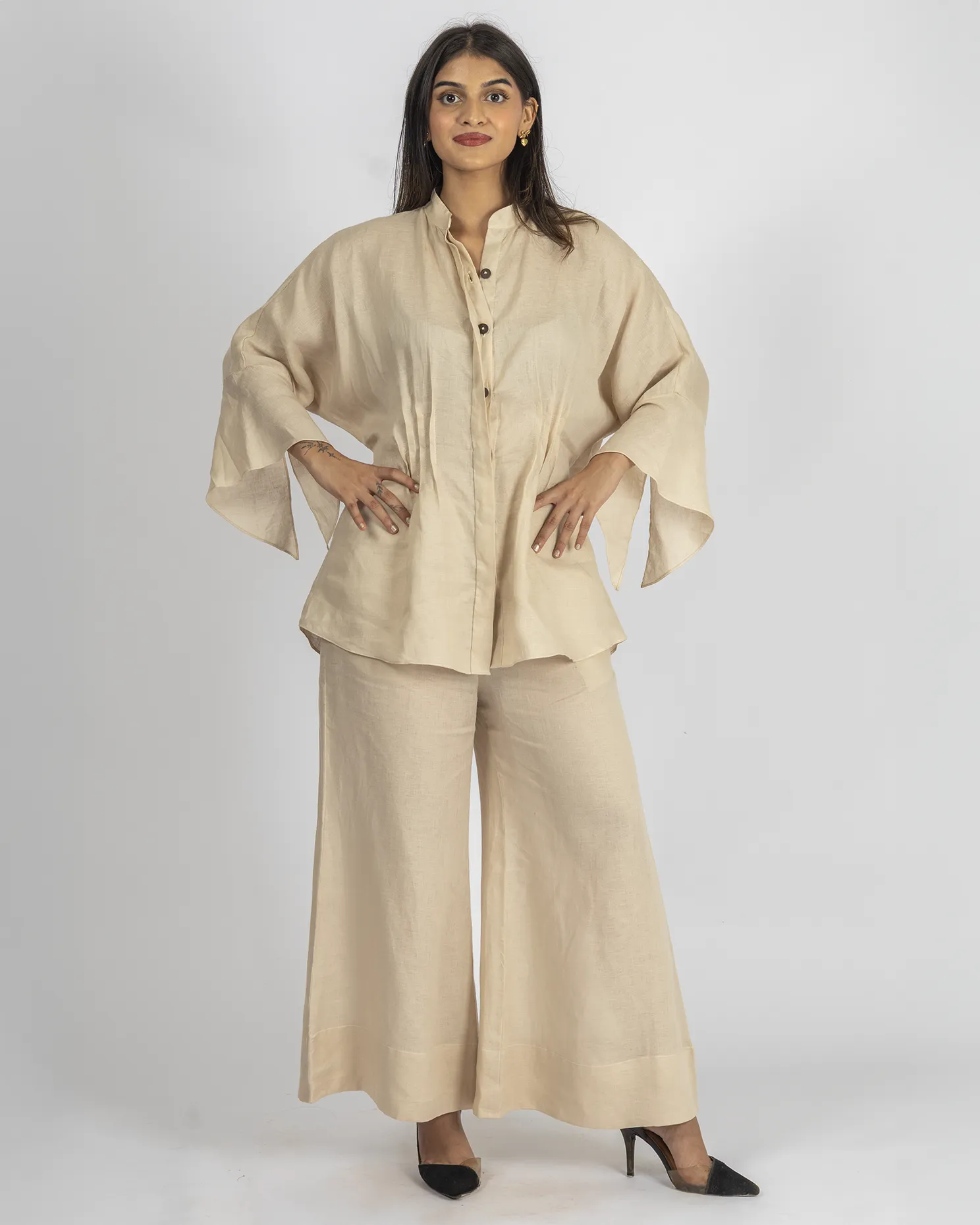 Top: Style your wardrobe with this beige linen shirt featuring a sleek Chinese collar and elegant tuck detailing at the front and back. Designed with full sleeves and flared slit cuffs for a modern, relaxed silhouette.
