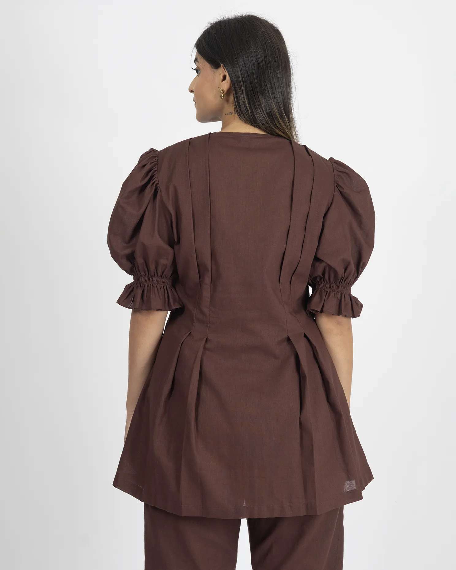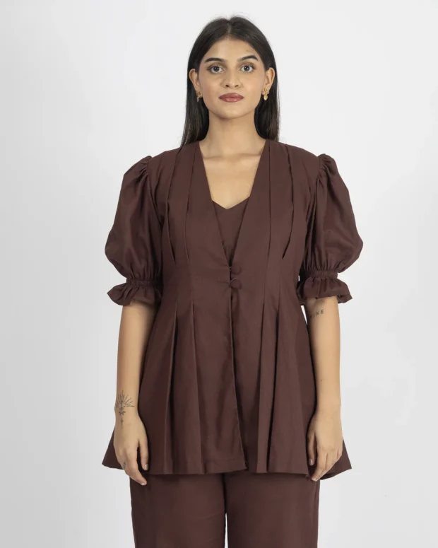 Coat: Add drama with this cocoa brown flared coat, styled with front buttons and elegant pleats cascading from shoulder to hem, both front and back. Finished with puff sleeves and ruffled elastic cuffs for a sophisticated flair.