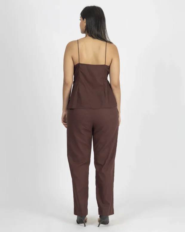 Bottom: Tailored cocoa brown straight-fit pants with a clean front opening, designed for versatile, everyday elegance.