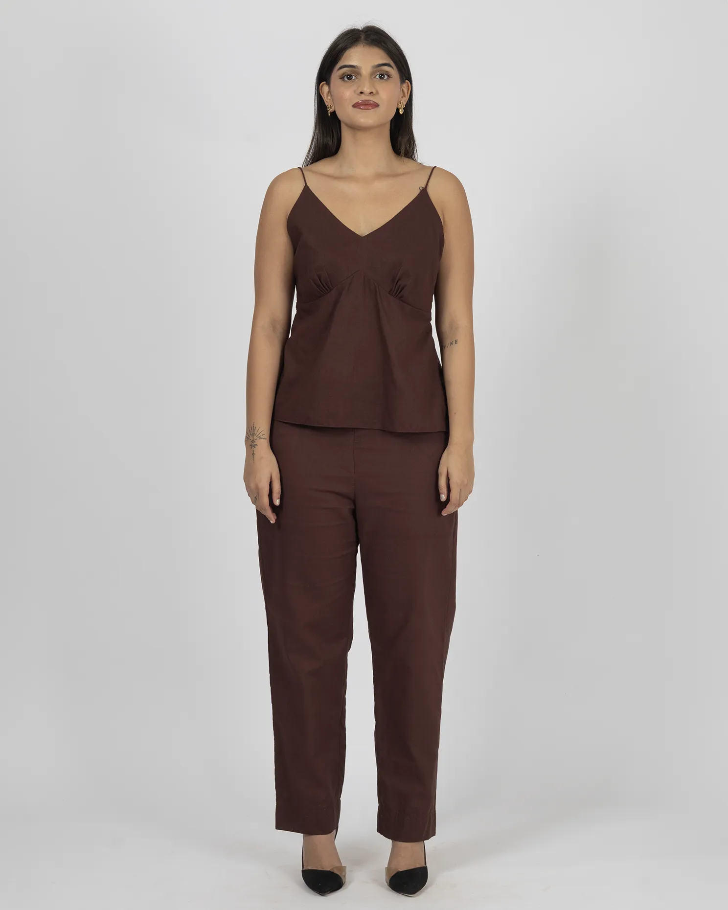 Top:Cocoa brown spaghetti top featuring a flattering V-neckline and soft gathered detailing for a feminine, minimalist touch.