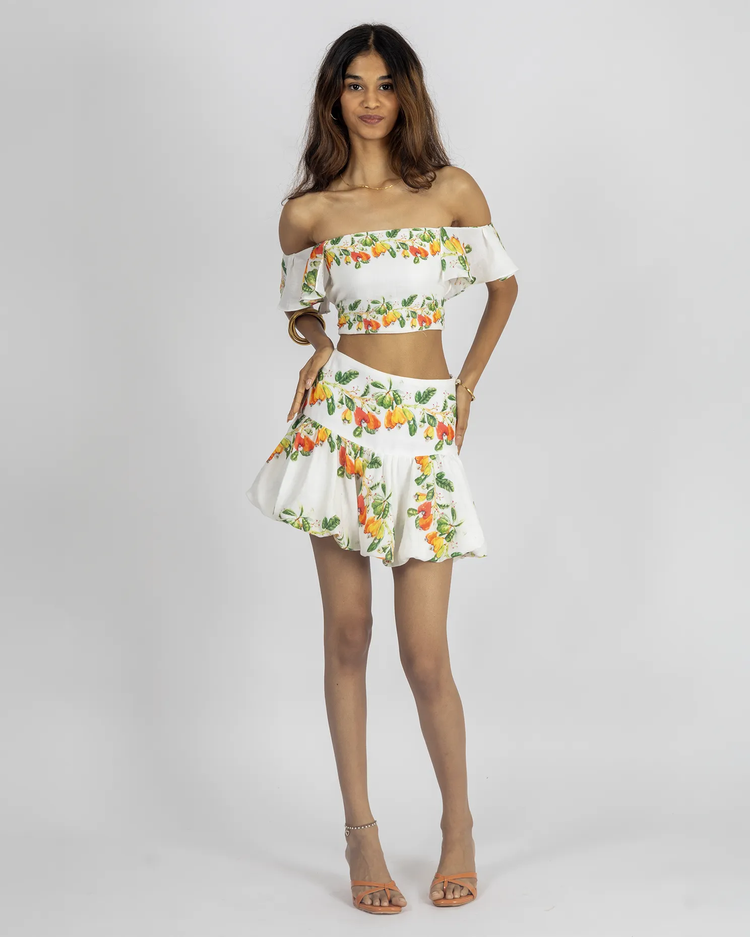 Playful and chic, this co-ord set features a digitally printed white cotton blouse with an off-shoulder neckline, flared short sleeves, and a backless design with elastic straps for a secure fit. Paired with a matching short skirt, styled with a wide yoke, side opening, and ruffled balloon silhouette—perfect for sunny days and statement looks.
