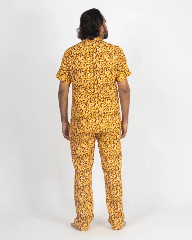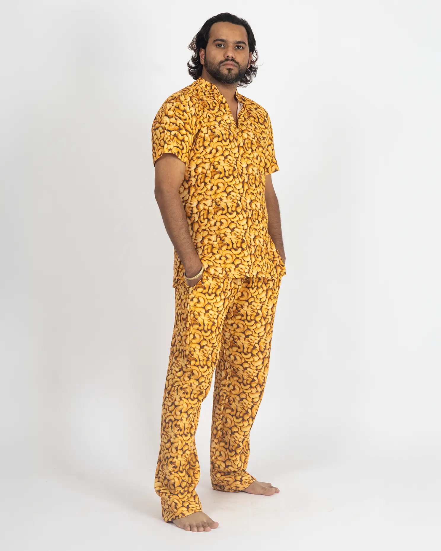 The shirt features a unique cashew nut digital print, Chinese collar, half placket, and side slits for a relaxed yet refined fit. Paired with matching straight-fit cotton pants, featuring an elastic waistband and practical side pockets—perfect for effortless style and all-day comfort.