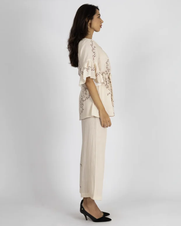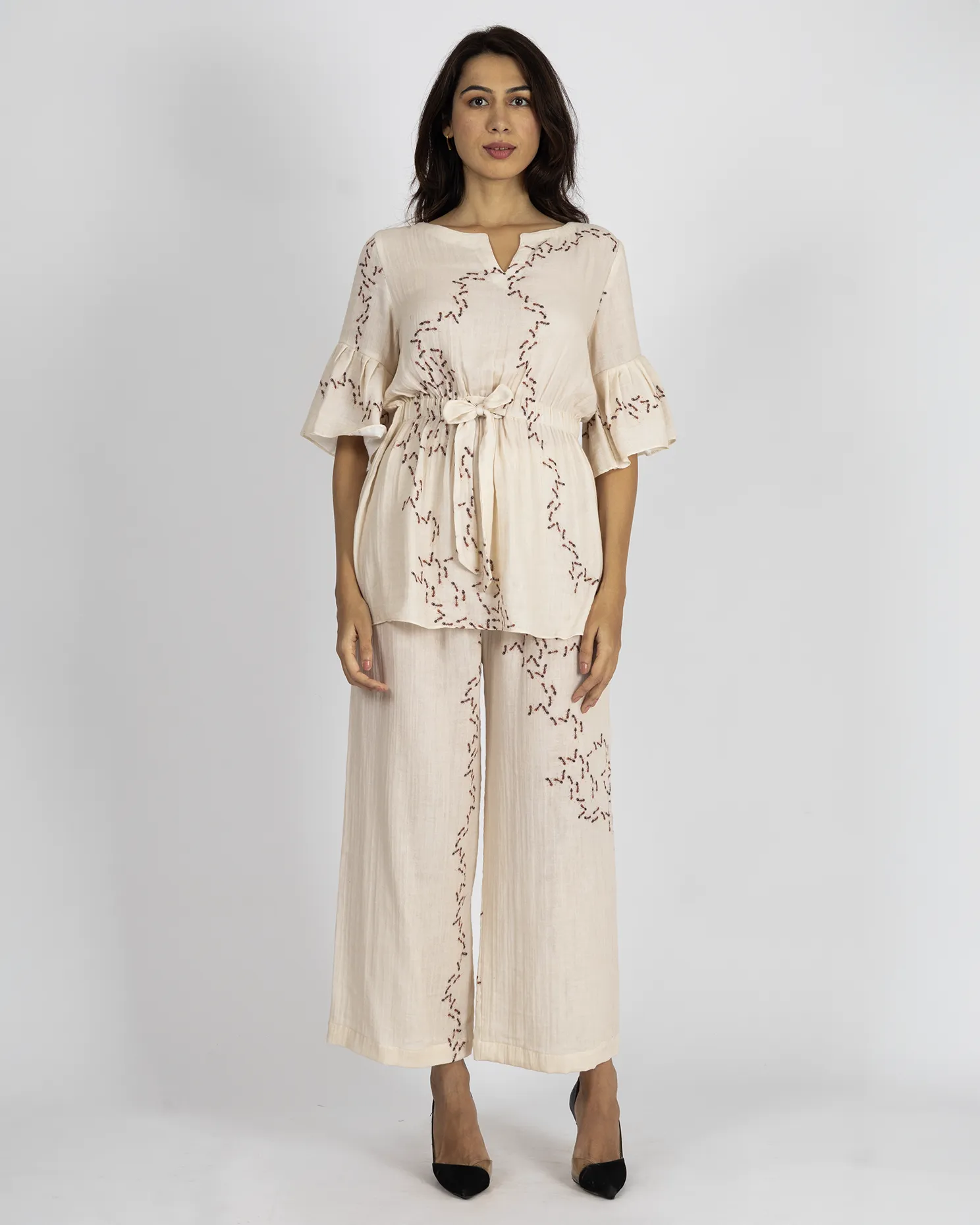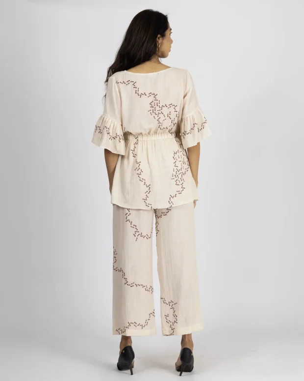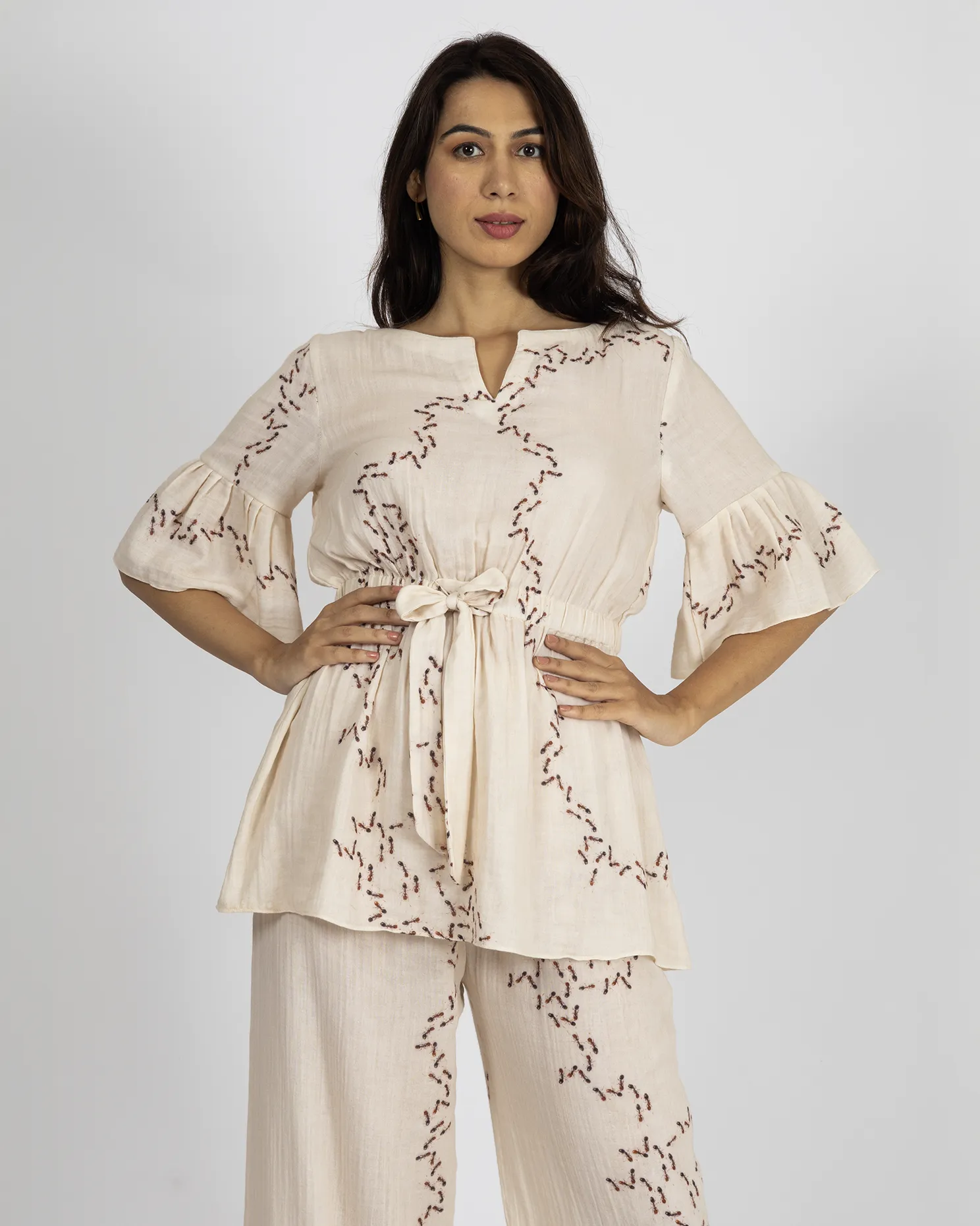 Top: A playful yet elegant beige cotton top featuring a quirky ants digital print. Designed with a split round neckline, half sleeves with flared cuffs, and a tie-up elastic waist that flares gracefully below—offering both shape and movement.