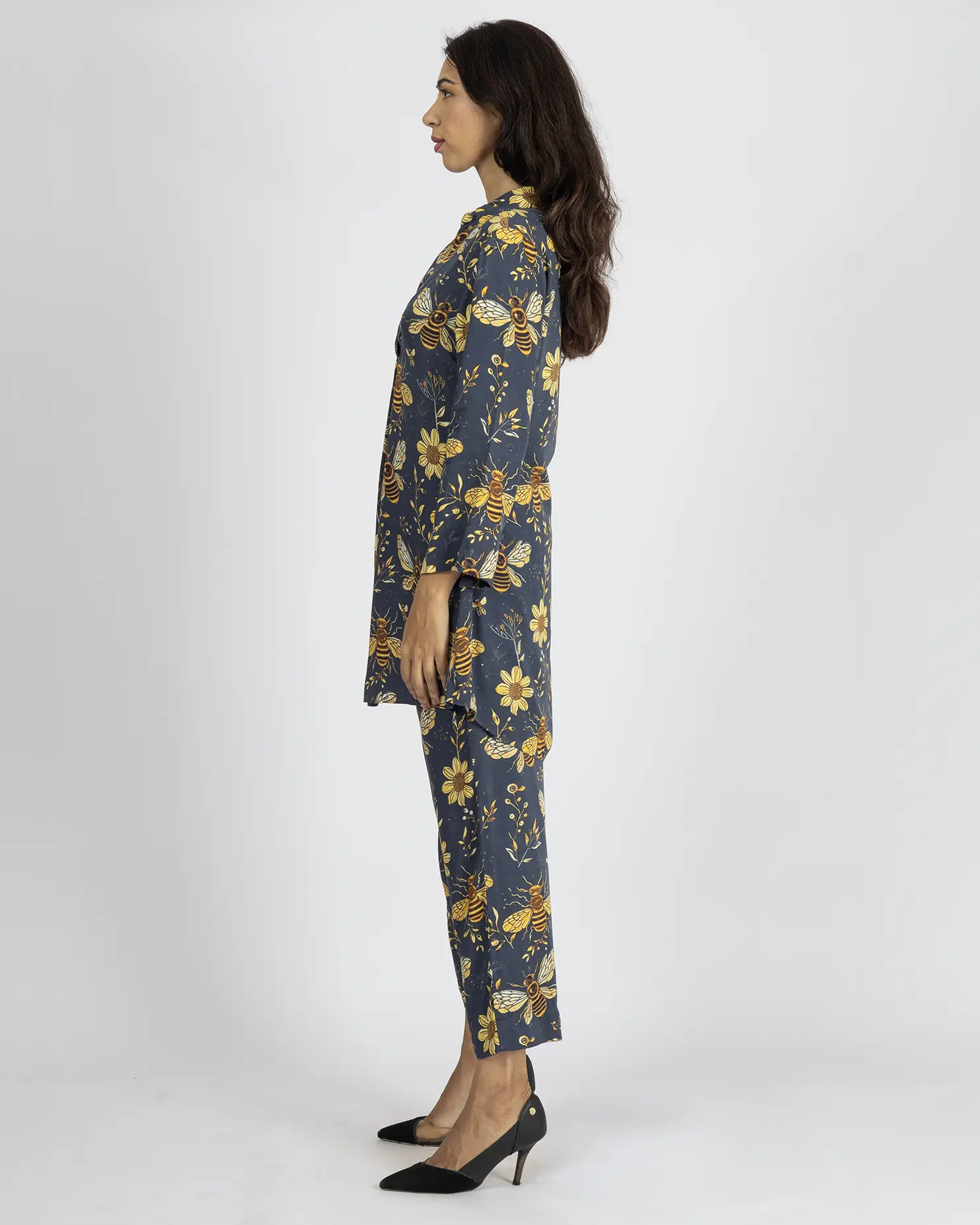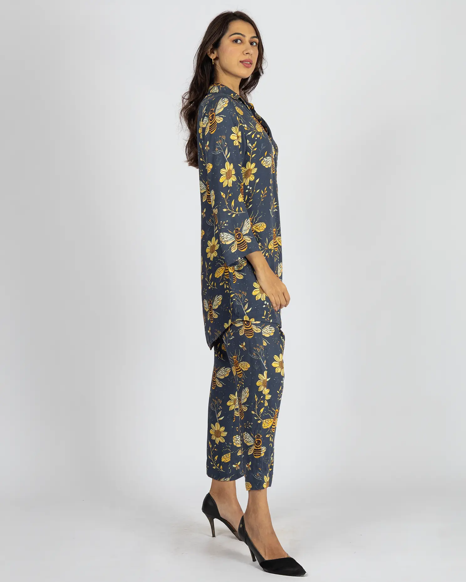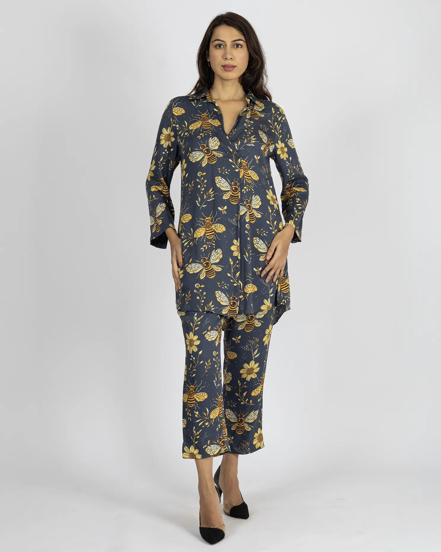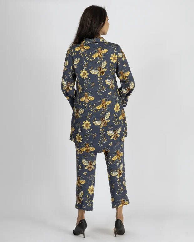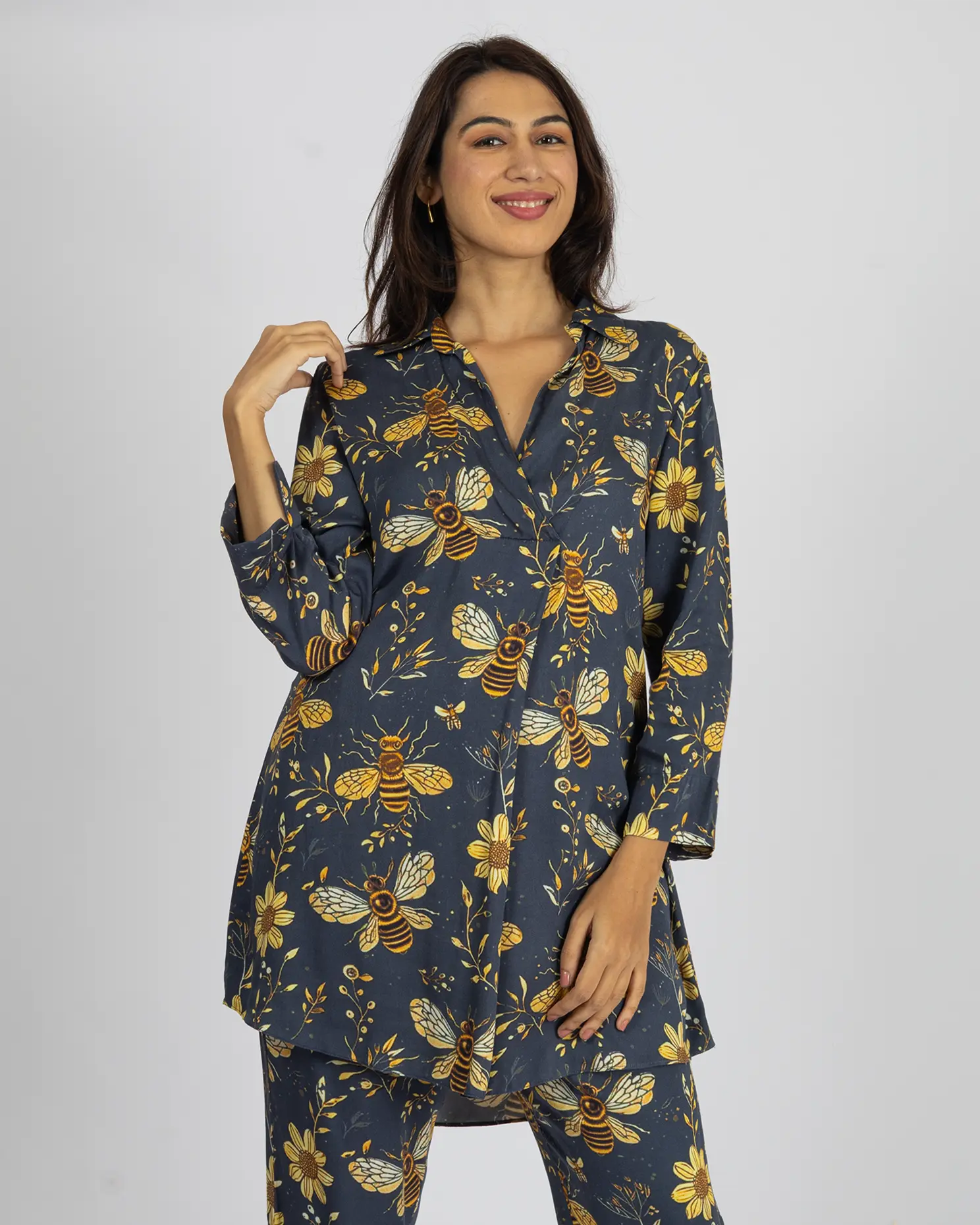Top: This Deep Oxford Blue top, adorned with a vibrant honeybee and sunflower digital print. Featuring a structured shirt collar and a deep V-neckline, it blends elegance with playful charm.