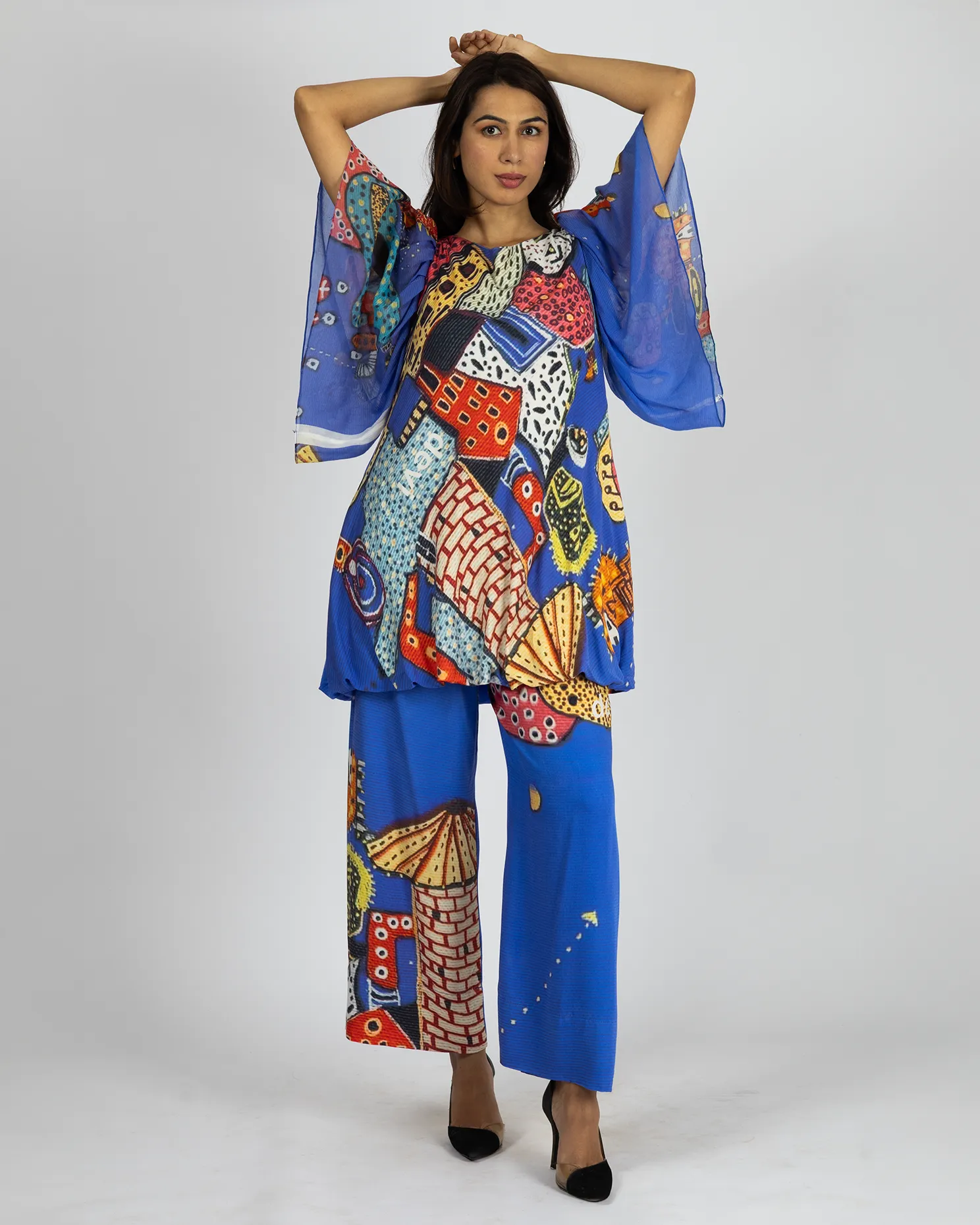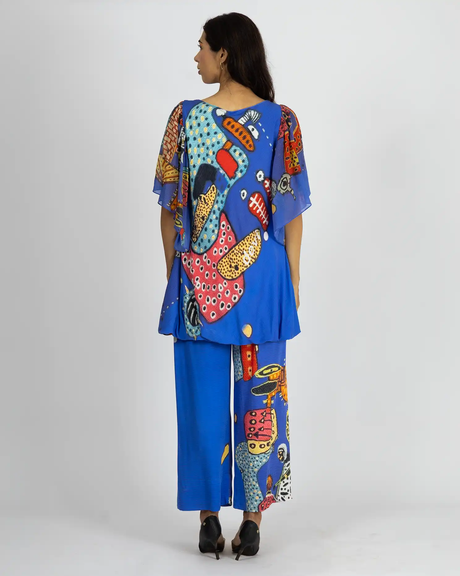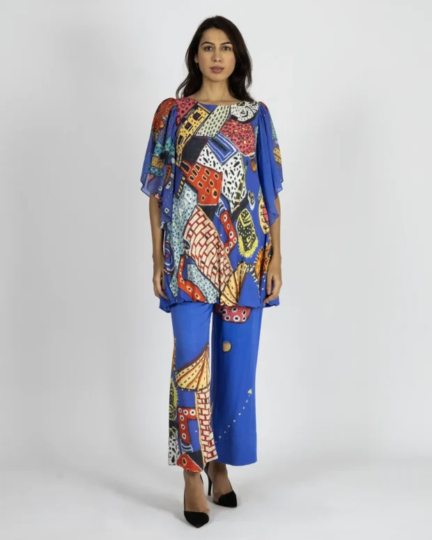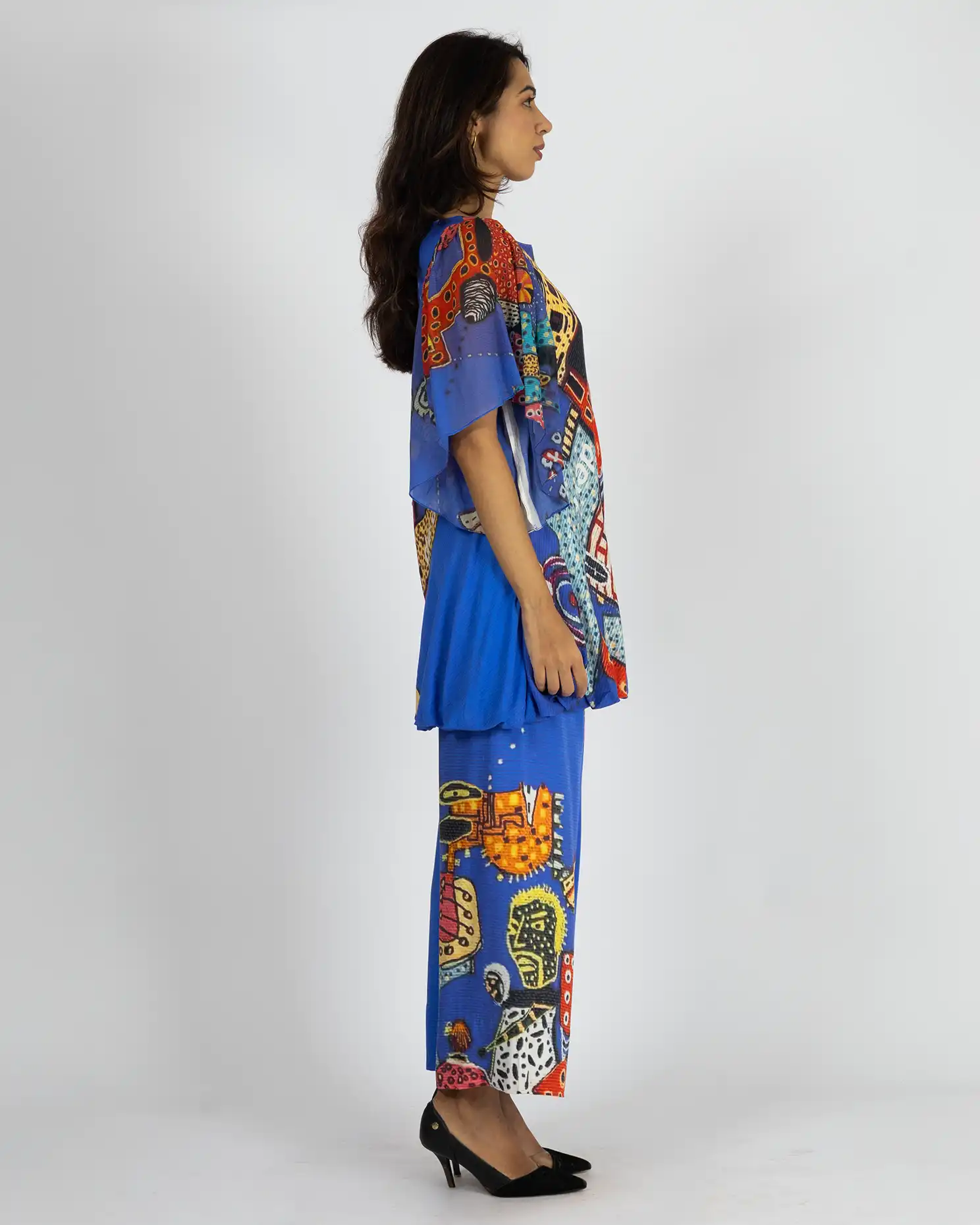 Bottom: Designed to complement the top, these royal blue straight-fit cotton pants showcase a matching artistic print and a comfortable elastic waistband for effortless wear.
