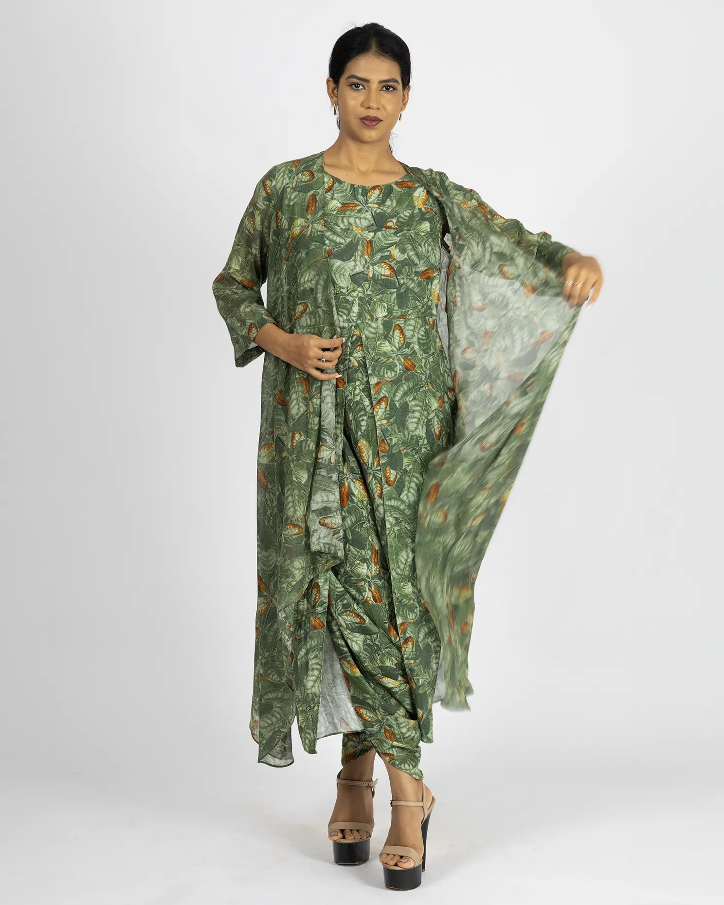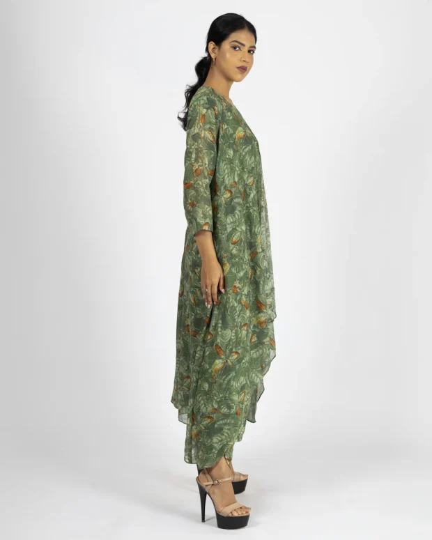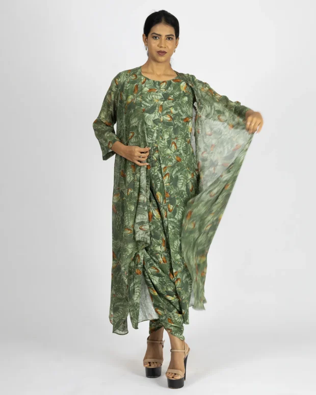 Jacket: Layer it with a matching mulmul jacket in the same dark green and brown cashew leaf print. Styled with ¾ sleeves and a high-low hem, it offers a light, breezy finish to the ensemble.
