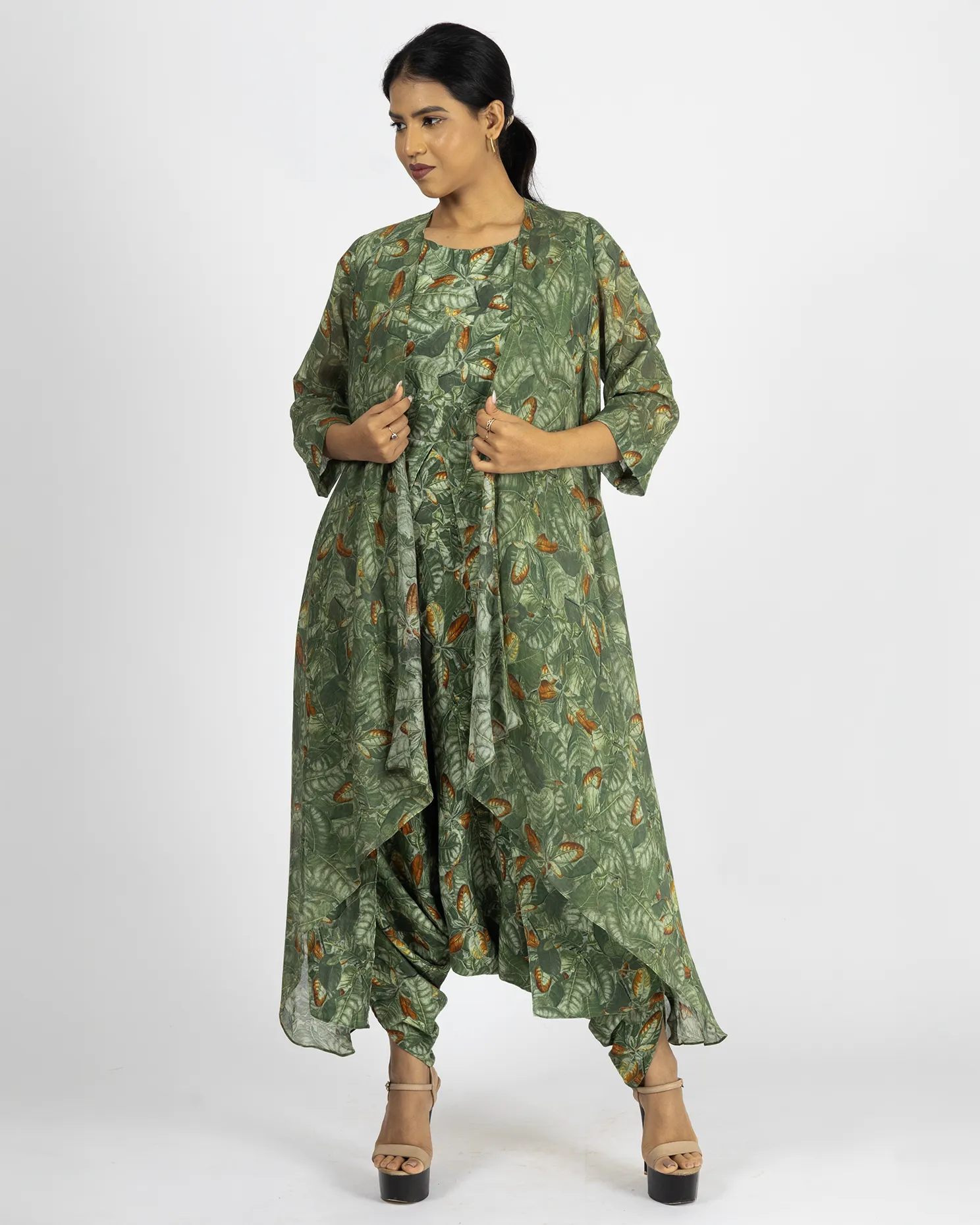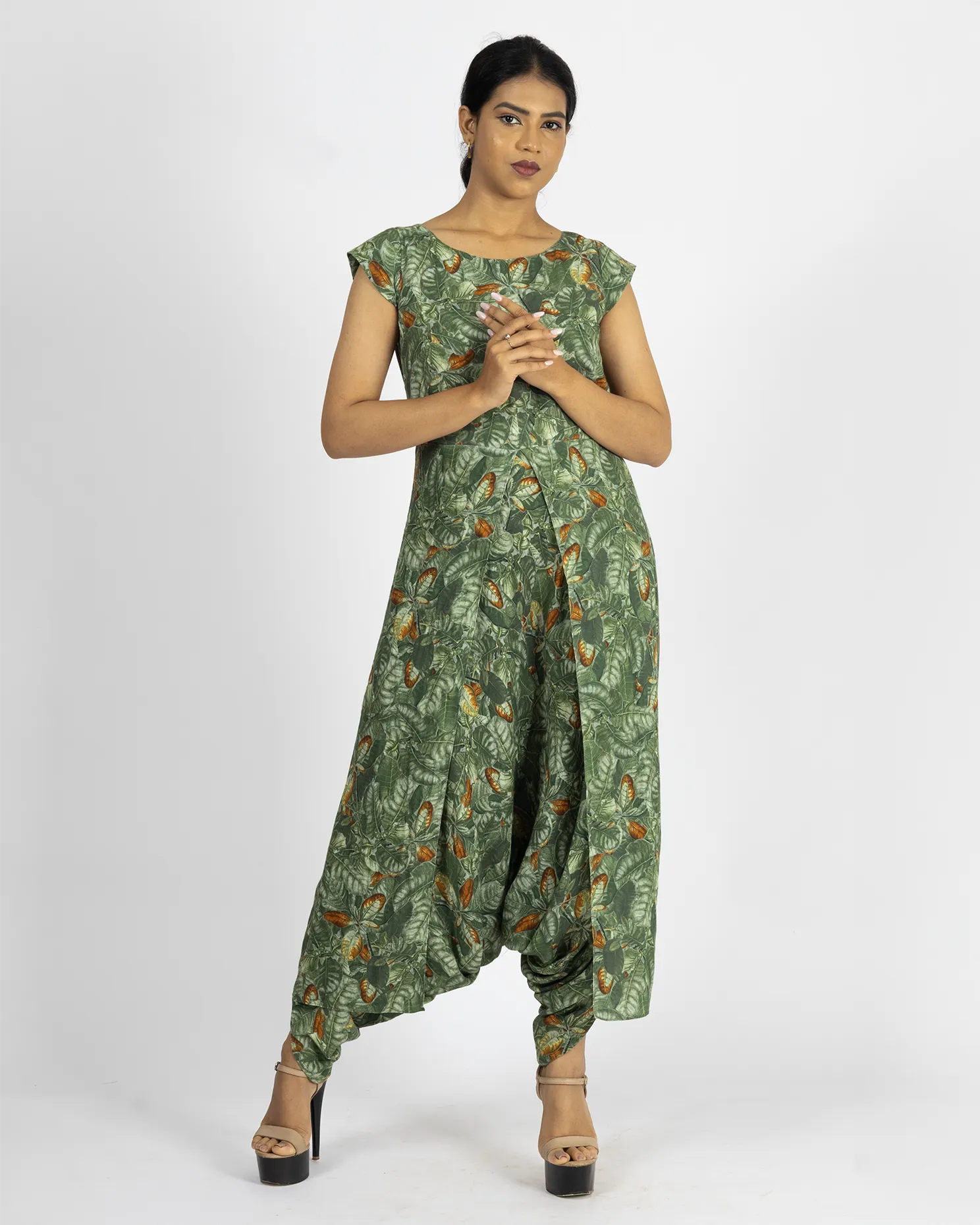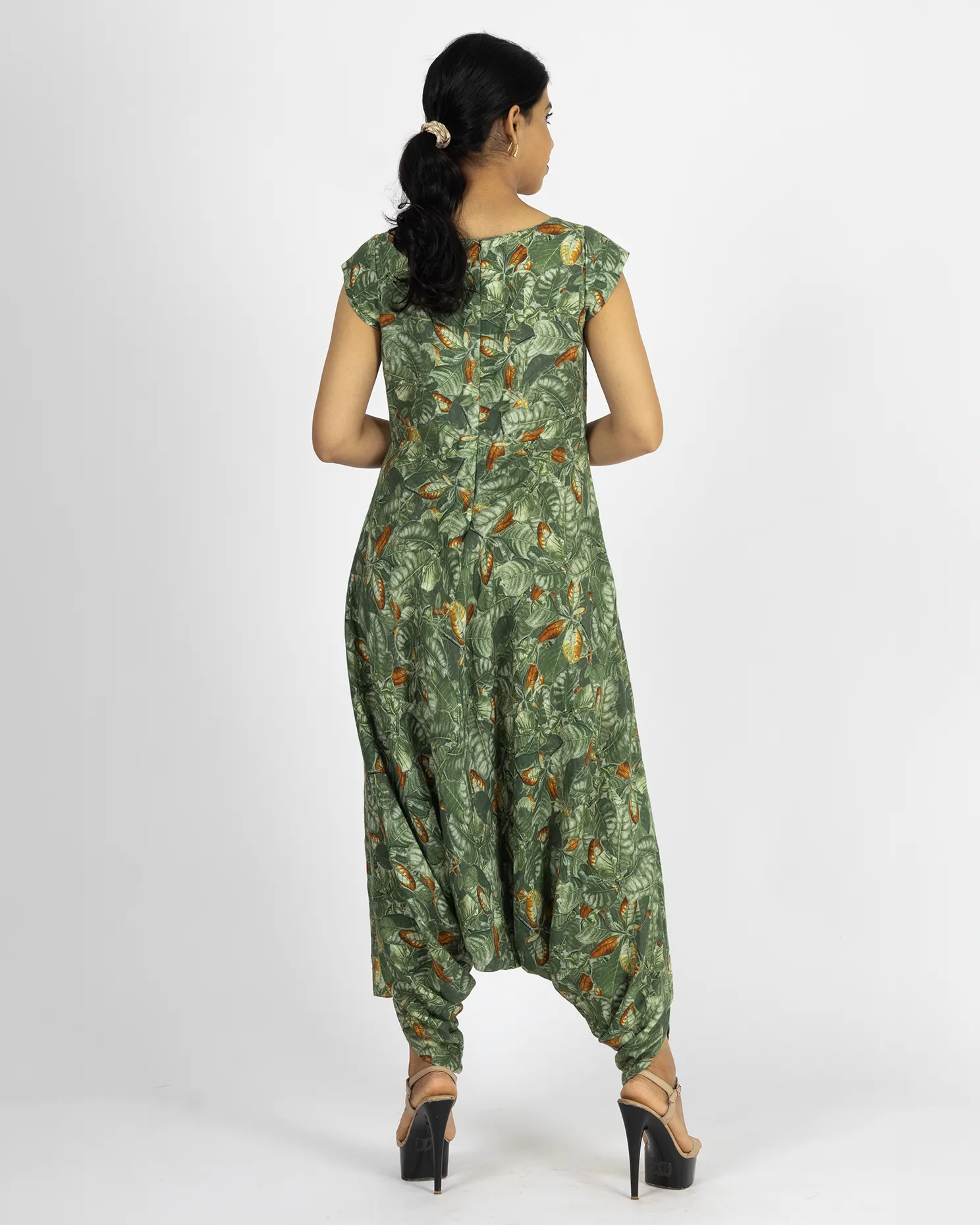 Jumpsuit: Dark green cotton jumpsuit featuring brown digital printed cashew leaves. Designed with a round neckline, cap sleeves, and a back open detail for a touch of elegance. The dhoti-style pants add a unique, contemporary twist to the silhouette.