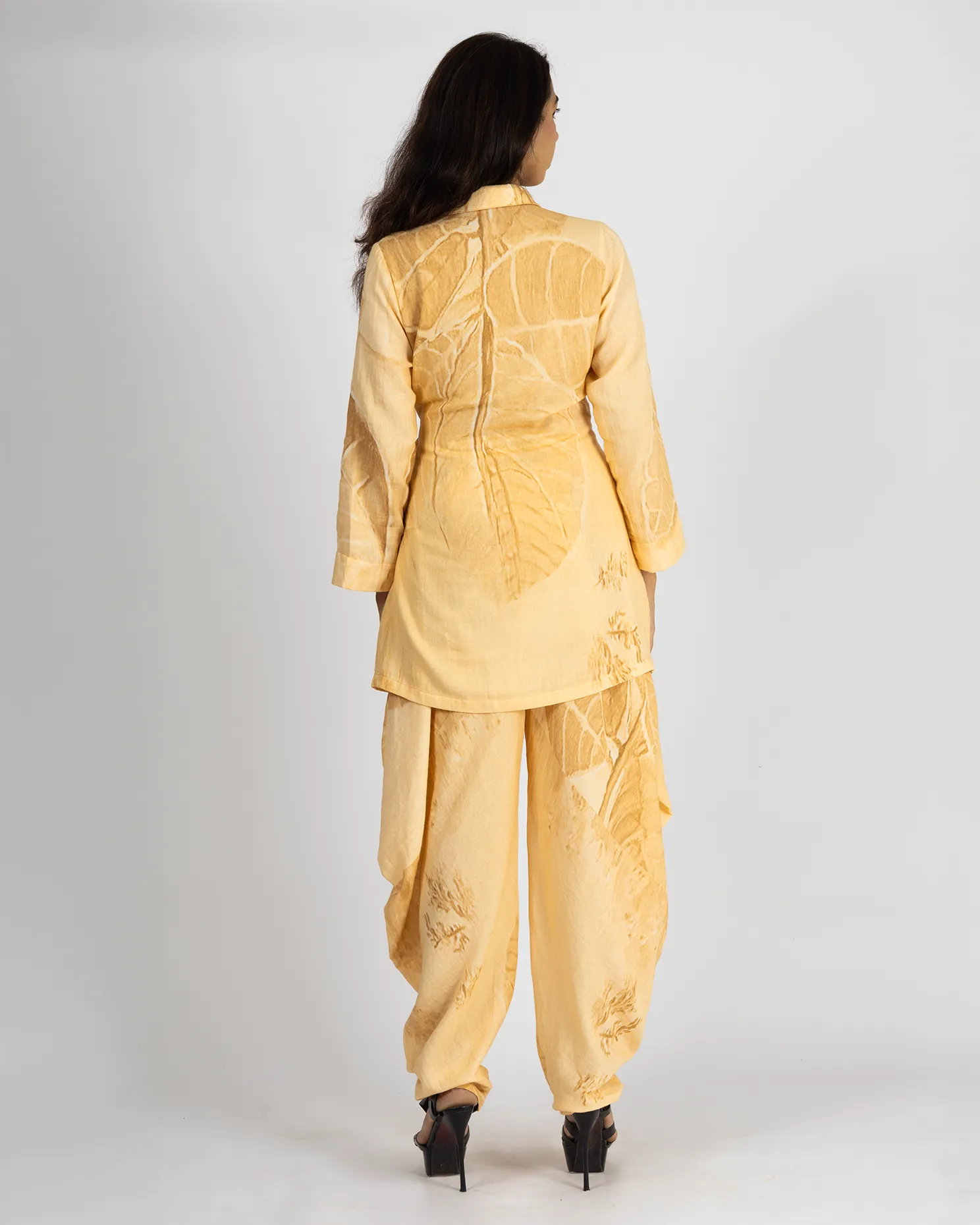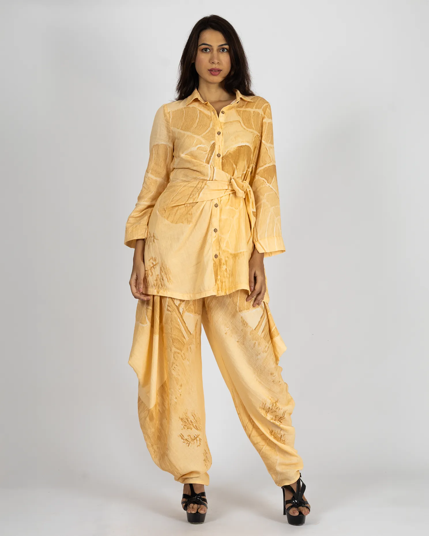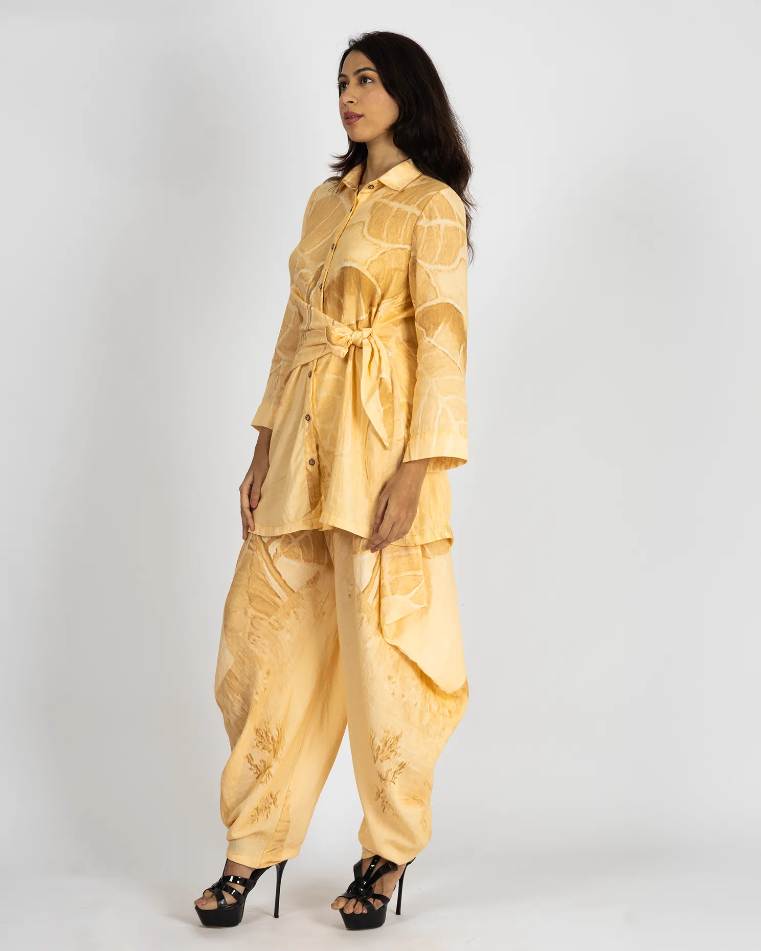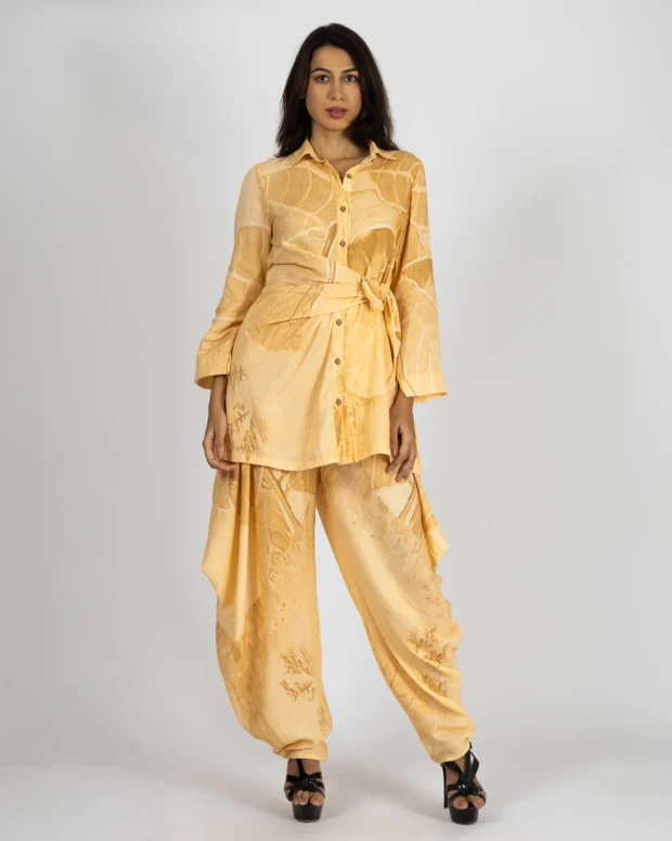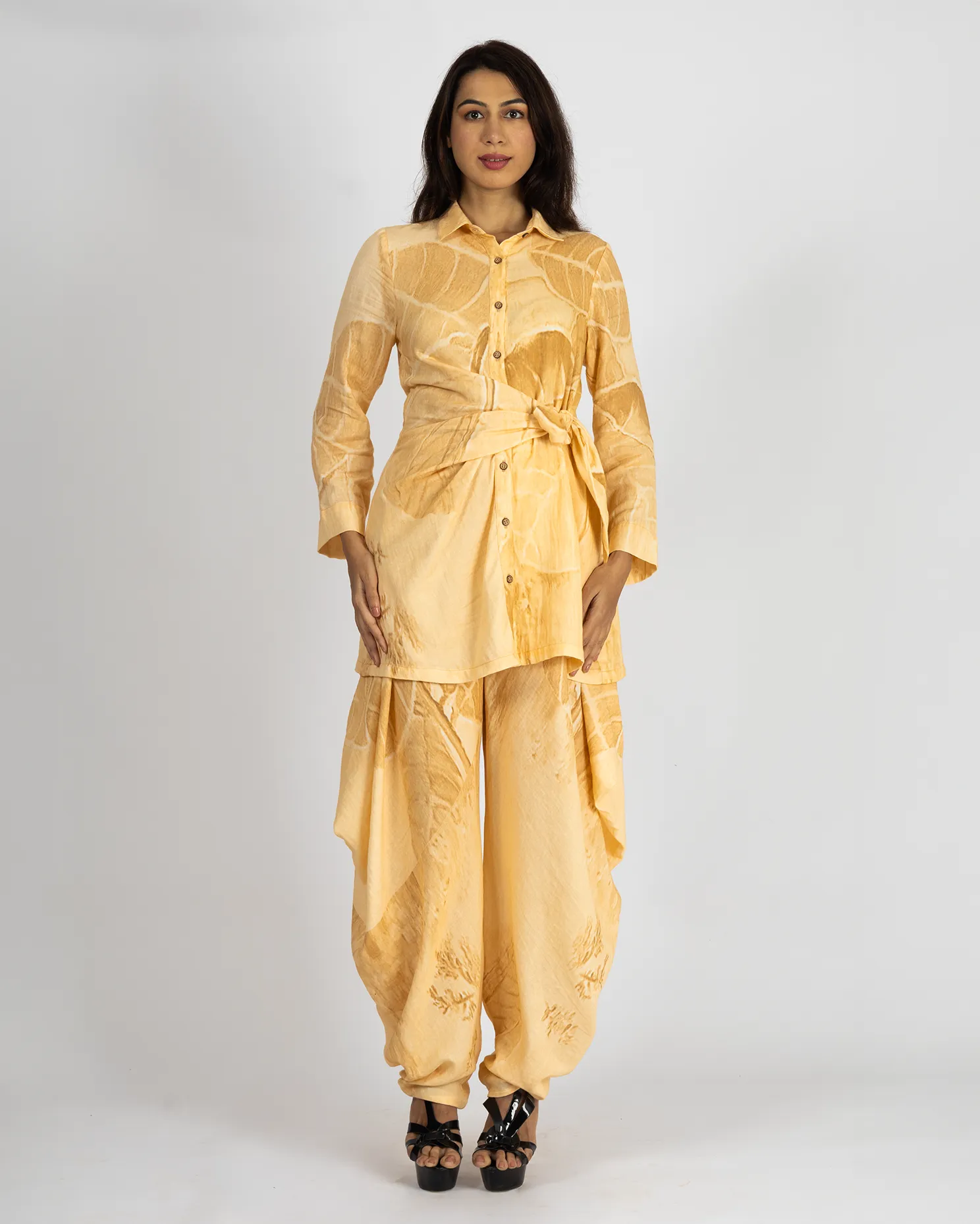 Bottom: Coordinating sandal yellow side-cowl pants adorned with the same digital cashew leaf print. Designed with an elastic waistband for all-day comfort and a modern, draped finish.