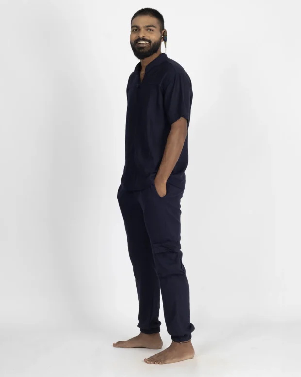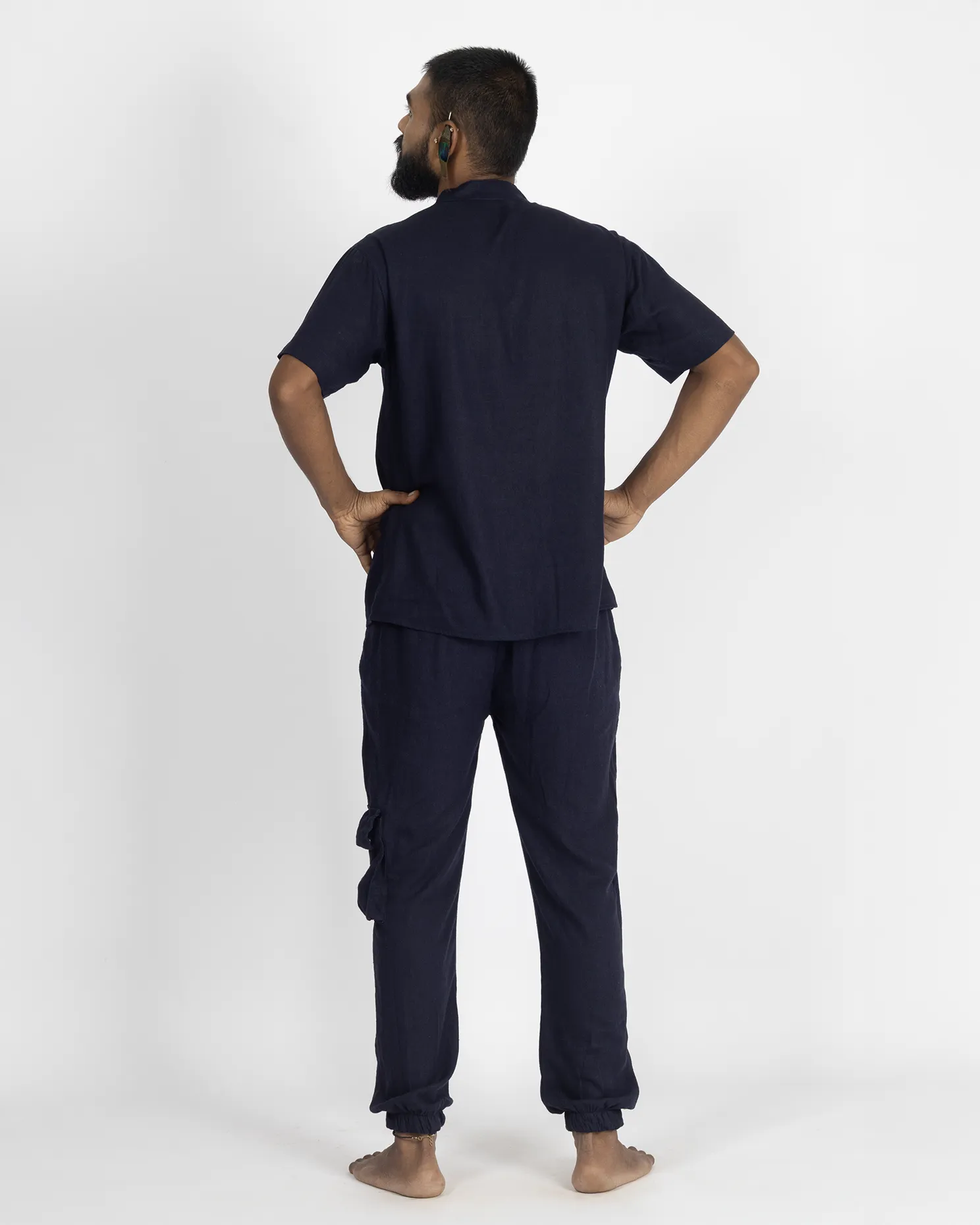 Modern and refined in navy blue linen, this men’s co-ord pairs a short kurta with Chinese collar and ball button placket, matched with jogger pants featuring an elastic waist, side and cargo pockets, and elasticated ankles.