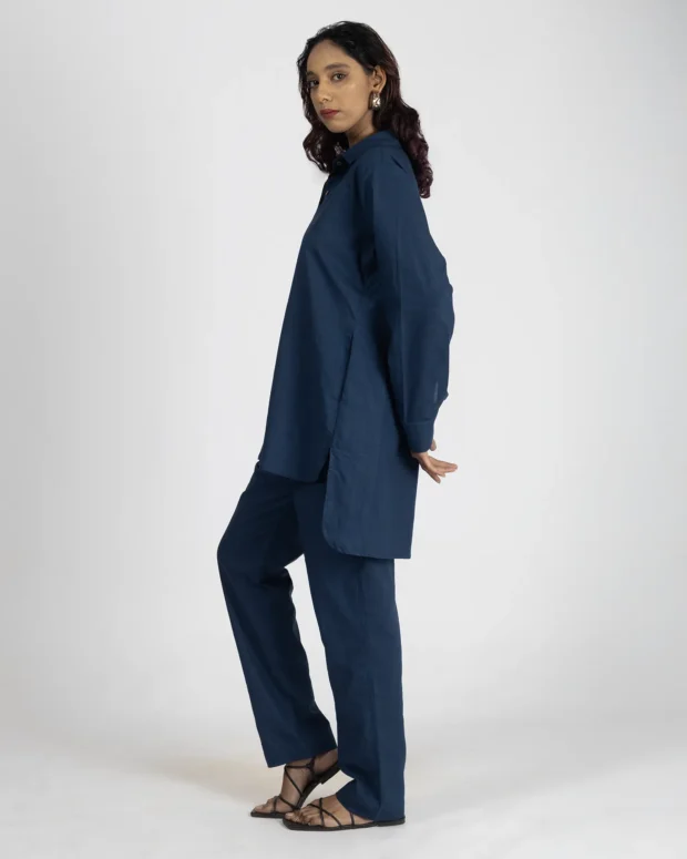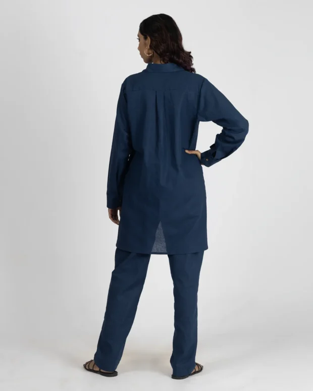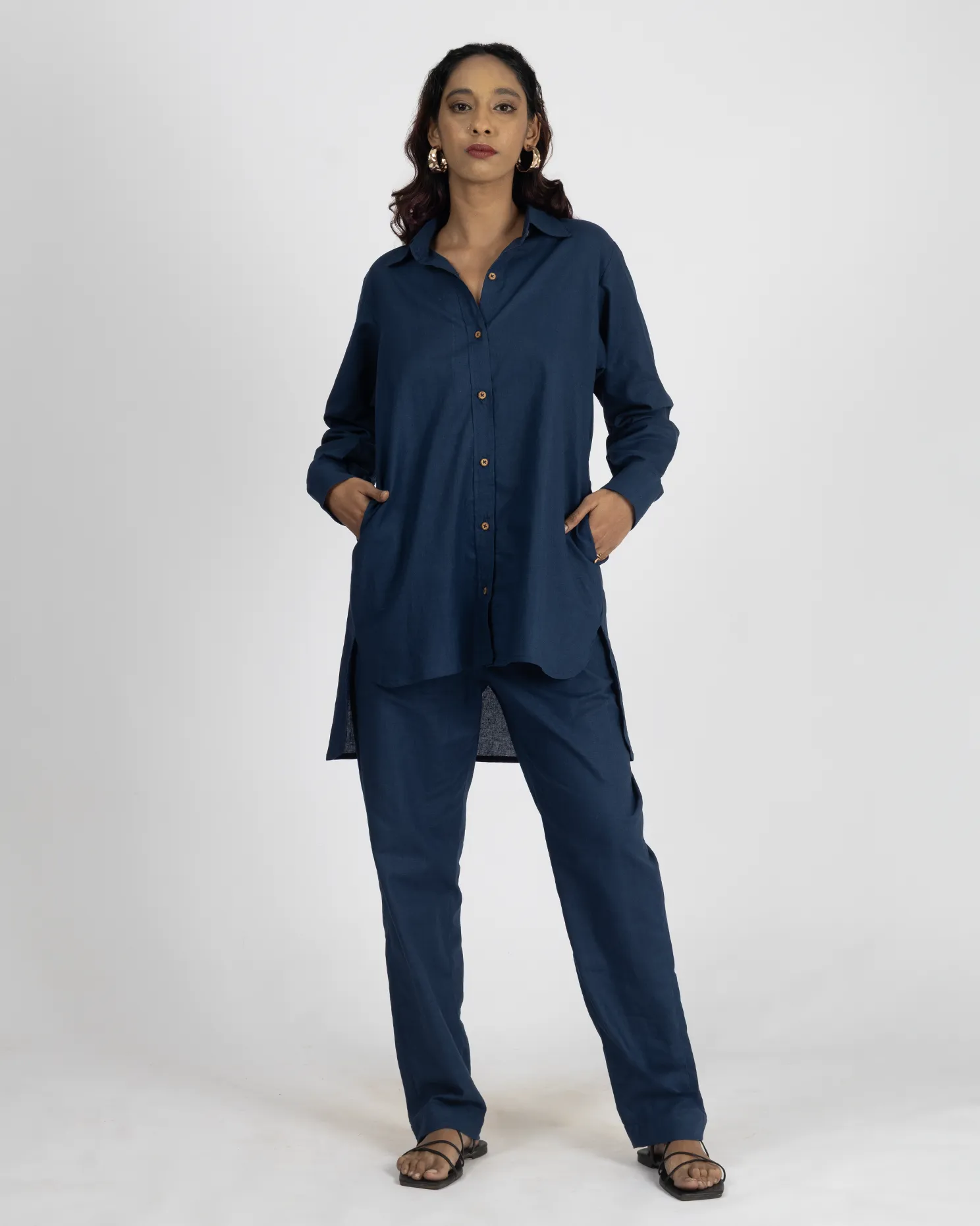 Elegant in Prussian blue, this linen co-ord pairs a full-placket shirt with cuffed sleeves, side pockets, and rounded slit hem, matched with straight pants featuring an elastic waist, side pockets, and broad zip hem