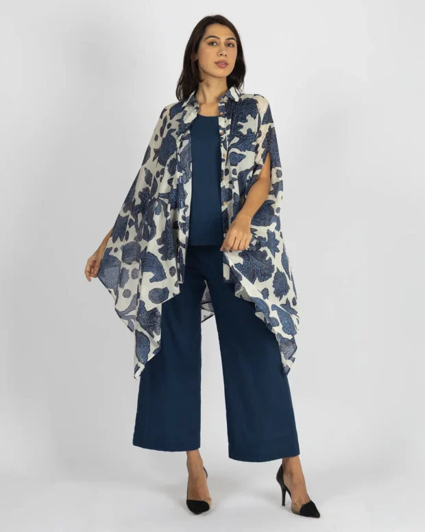 Jacket: Add a touch of artistry with this lightweight handkerchief-hem jacket in soft white mulmul, adorned with a marine life-inspired blue digital print. Designed with a shirt collar, front button closure, and open sleeve holes for a breezy, contemporary drape