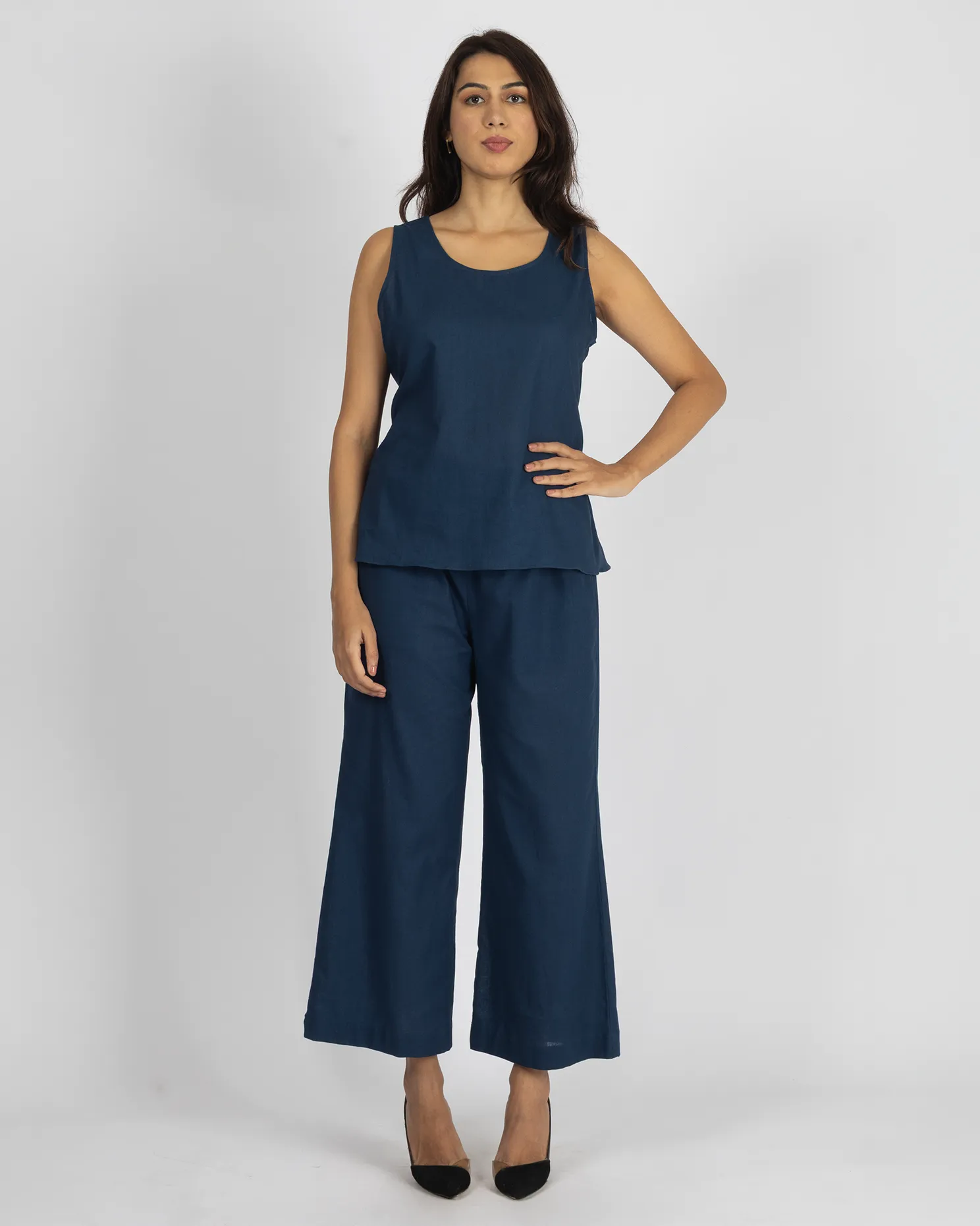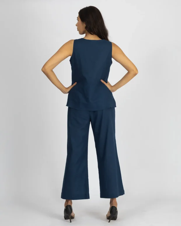 Top: Minimal and chic, this Prussian blue linen top features a round neckline and a sleeveless cut—perfect for effortless layering or solo wear.
