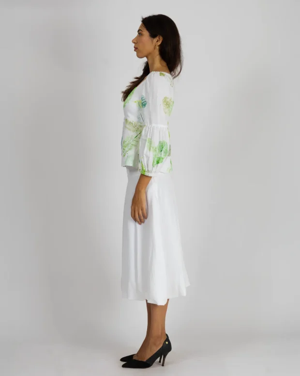 Top: White Cotton top featuring delicate handprinted cashew leaves, styled with an empire waist and a softly flared bottom. The square neckline in front and round back add a charming silhouette, while ¾ puff sleeves with center knife pleats and elastic cuffs offer a refined, structured touch.