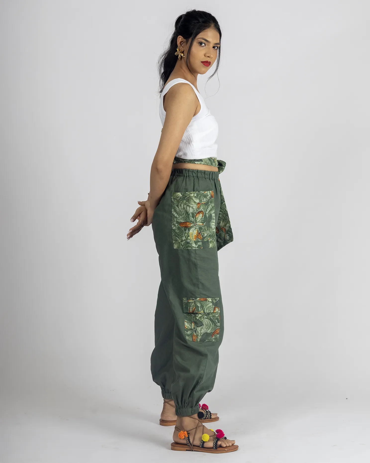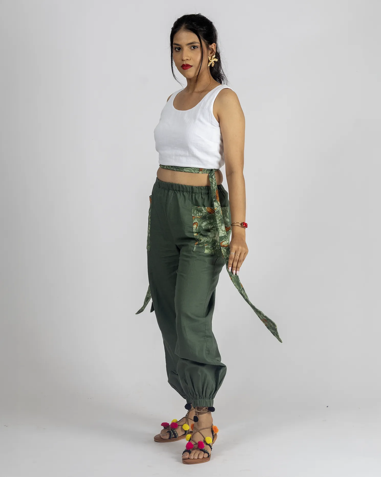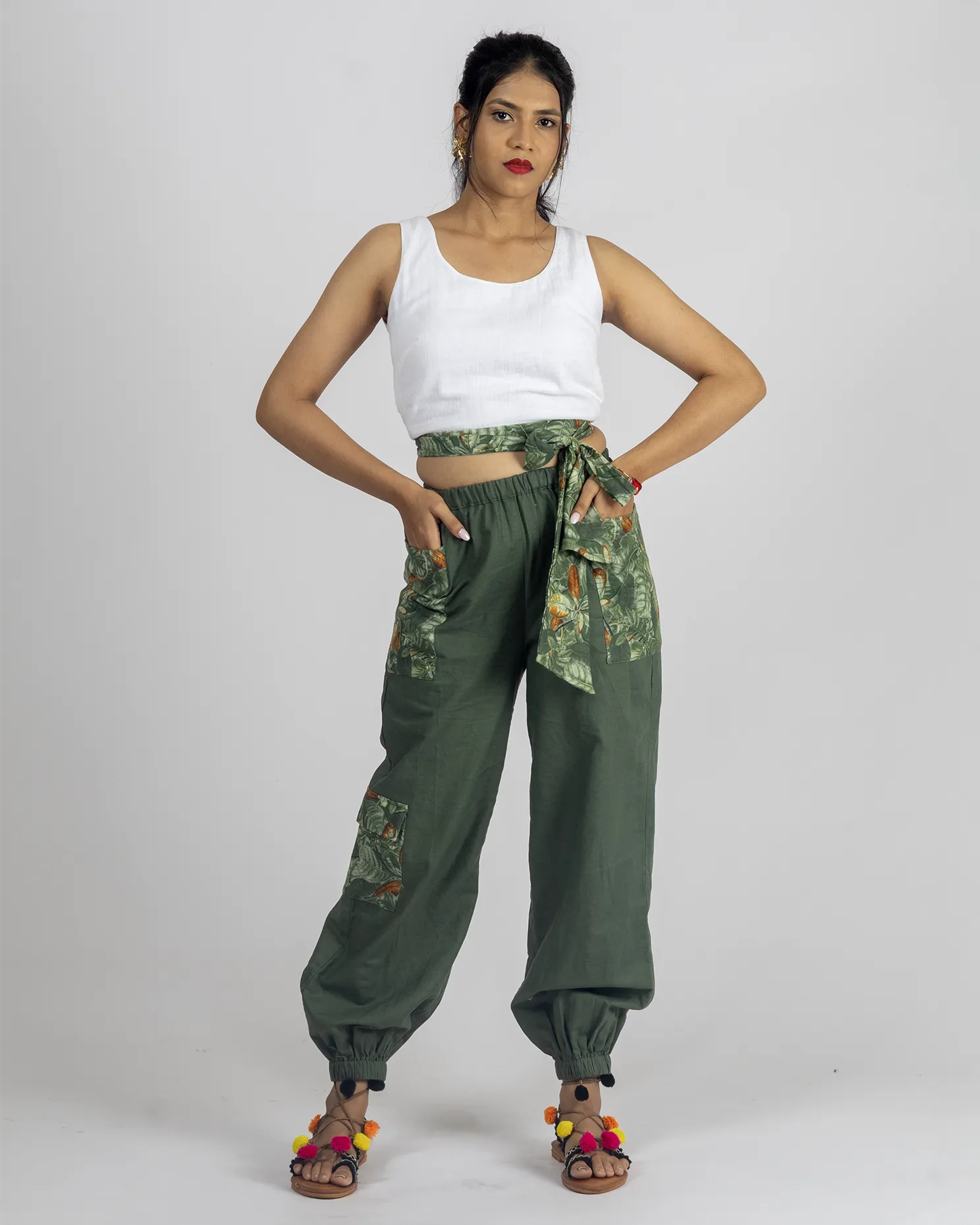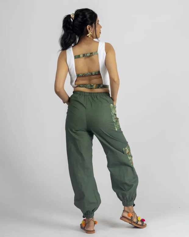 Bottom: Green cotton joggers with comfy elastic waist and ankle, finished with matching printed pockets and a flap detail for a trendy edge.
